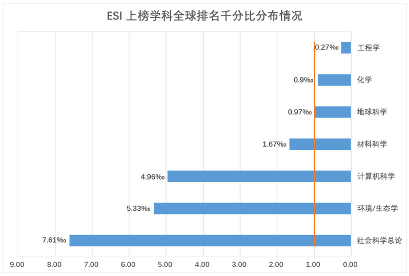 目前,学校共有7个学科进入ESI全球排名前1%,分别是化学、工程学、材料科学、地球科学、计算机科学、环境/生态学、社会科学总论。其中,工程学进入ESI全球前万分之2.7,化学进入全球排名前0.90‰,地球科学进入前0.97‰,材料科学进入前1.67‰,有望成为下一个进入ESI全球排名前1‰的学科。